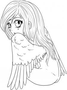 Проведите контур лица. На вспомогательных линиях нарисуйте большие глаза. Левый глаз значительно меньше так как он скрыт частично. На центральной линией нарисуйте нос. Сделайте объемную прическу. Прорисуйте пряди волос на лице и на спине. Нарисуйте крылья как на картинке. У спины перья совсем маленькие, а на концах перья более широкие и длинные.