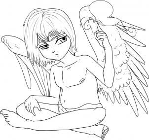 Прорисуйте глаза и брови. Сделайте короткую, объемную прическу. Край сделайте неровной линией прорисовываем отдельные пряди. На крыльях прорисуйте перья разной длины. Нарисуйте линии груди и ключиц. Нарисуйте пальцы ног и контуры ног.