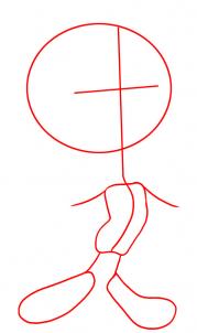Нарисуйте круг головы и пересекающиеся линии в центре. Проведите линию шеи и ниже нарисуйте маленькое тело. Линиями изобразите крылышки. Лапы изобразите большими неправильными овалами.