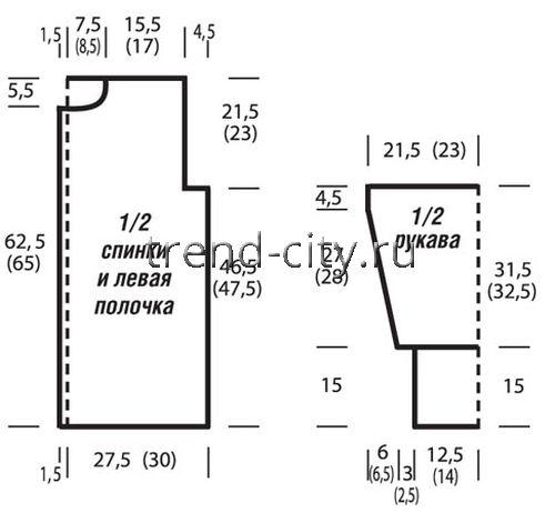 Через 62,5 (65) см от начального ряда закрыть для горловины по левому краю 7 (9) петель, затем в каждом 2-м ряду 1 x 3 п. и 3 x 1 п.