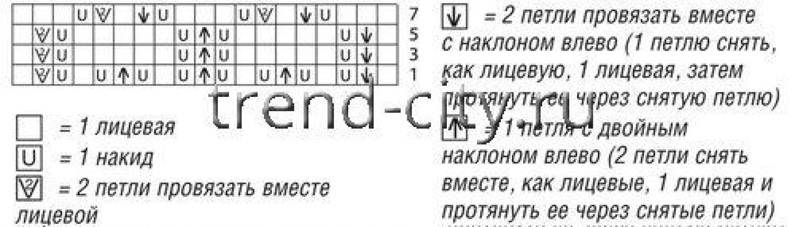 2-й ряд: * из следующей петли вывязать 1 лицевую, 1 изнаночную и 1 лицевую, 3 петли провязать вместе изнаночной, от * постоянно повторять;