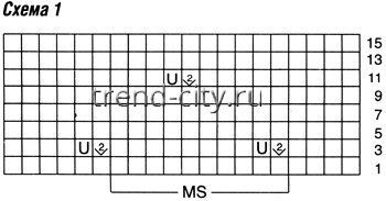 число петель кратно 10 + 2 кром. Вязать по схеме 1, на которой приведены только лиц. р, в изн. р. все петли и накиды вязать изн. Начинать с 1 кром. и петель перед раппортом, повторять раппорт, заканчивать петлями после раппорта и 1 кром. Повторять с 1-го по 16-й р.