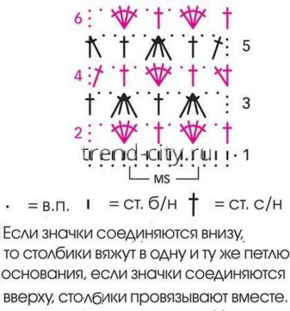 Вязать согл. схеме вязания узора крючком. Начать с петель перед раппортом, раппорт постоянно повторять, закончить петлями после раппорта.